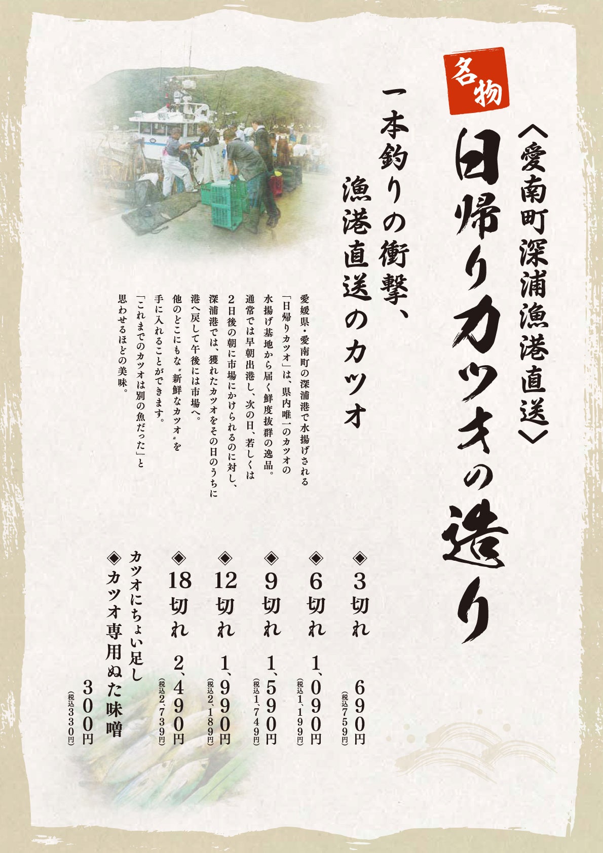 愛媛県・愛南町の深浦港で水揚げされる「日帰りカツオ」は、県内唯一のカツオの水揚げ基地から届く鮮度抜群の逸品。通常では早朝出港し、次の日、若しくは2日後の朝に市場にかけられるのに対し、深浦港では、獲れたカツオをその日のうちに港へ戻して午後には市場へ。他のどこにもない"新鮮なカツオ"を手に入れることができます。今までのカツオが本当のカツオの味ではなかったんだ」と錯覚するほどの美味。