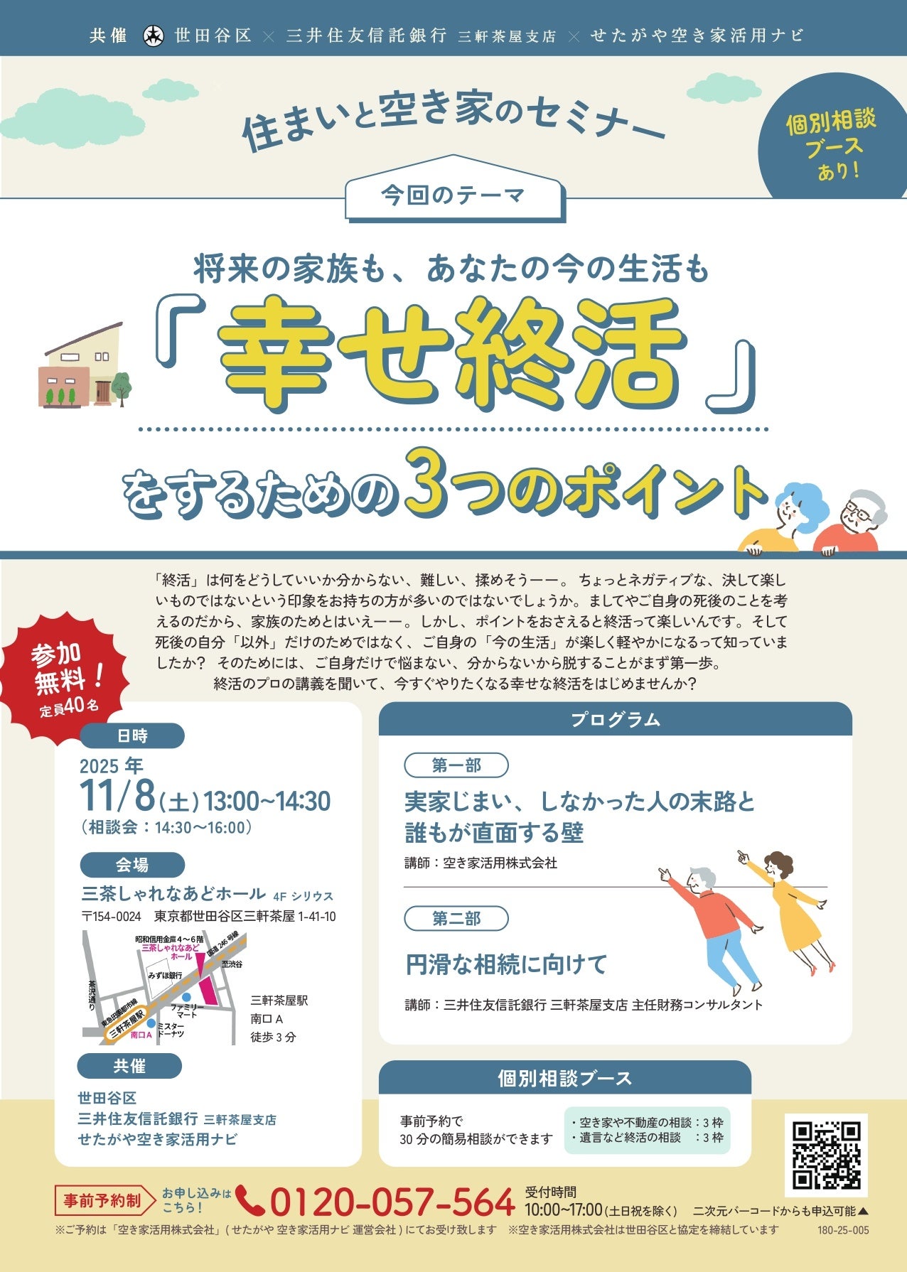 【参加無料】世田谷区主催「幸せ終活」を学ぶ!住まいと空き家のセミナー|11/8(土)
