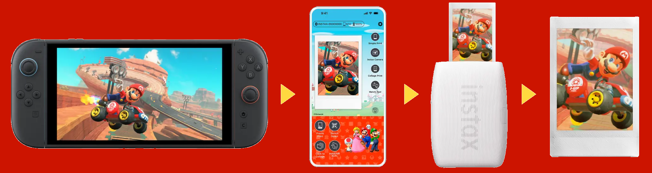 「Nintendo Switch 2」内でスクリーンショットしたゲーム画面や、動画から切り出した画像は、任天堂公式アプリ「Nintendo Switch App」に転送されます。同アプリからスマホに画像をダウンロード。「instax mini Link(TM) for Nintendo Switch」の「Simple Print機能」で簡単にチェキプリント(TM)にできます。