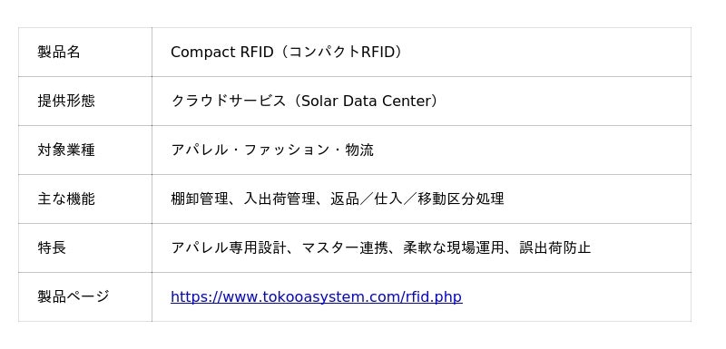 アパレル業界の入荷・出荷・棚卸などの物流業務をRFIDで効率化するシステム「Compact RFID(コンパクトRFID)」を、株式会社東光オーエーシステム(本社:東京都渋谷区、代表取締役社長:明石一寛)がリリースしました。