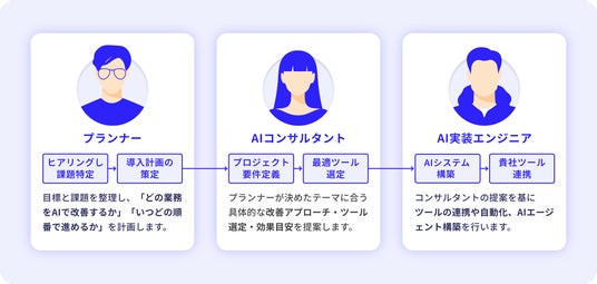 プランナー、AIコンサルタント、実装エンジニアの3名体制による専属AIチームが、企画から運用までを伴走し、採用や教育にかかるコスト・時間をかけずにAIプロジェクトを推進します。