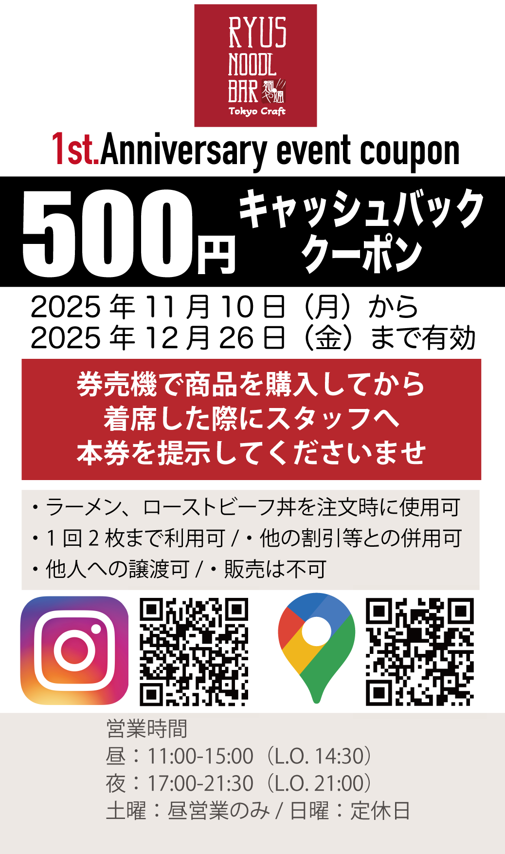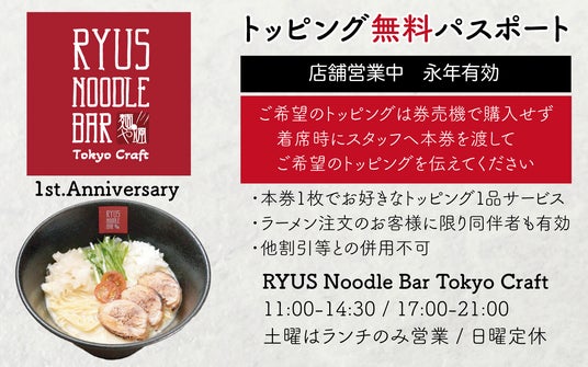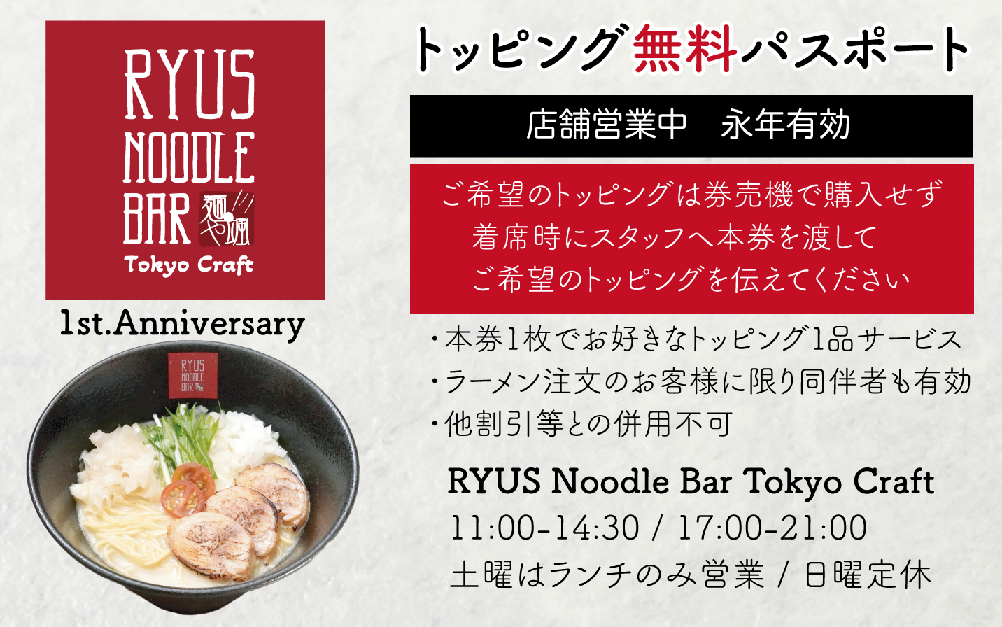 [オープン1周年記念イベント]RYUS Noodle Bar Tokyo Craftでラーメン1杯注文ごとに500円キャッシュバッククーポン配布!さらにトッピング永年無料パスポートもプレゼント!