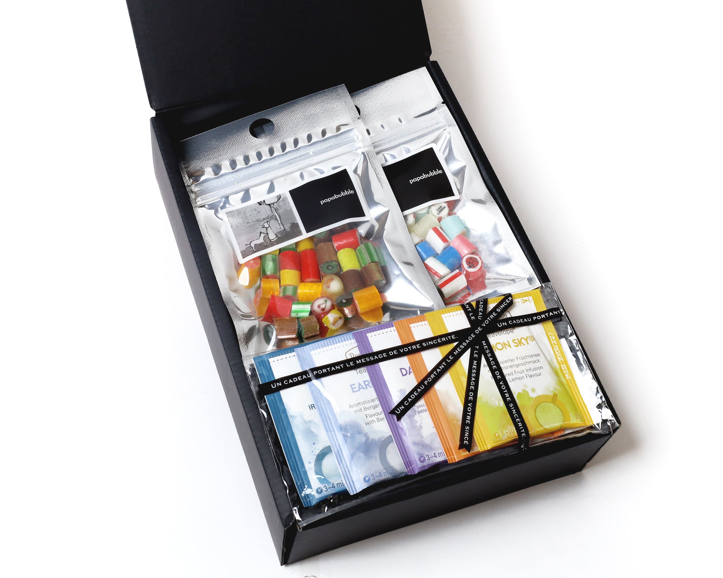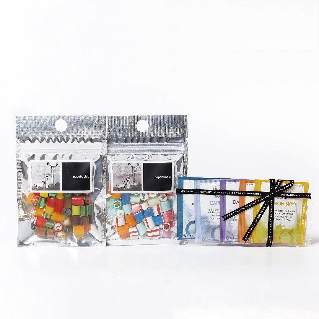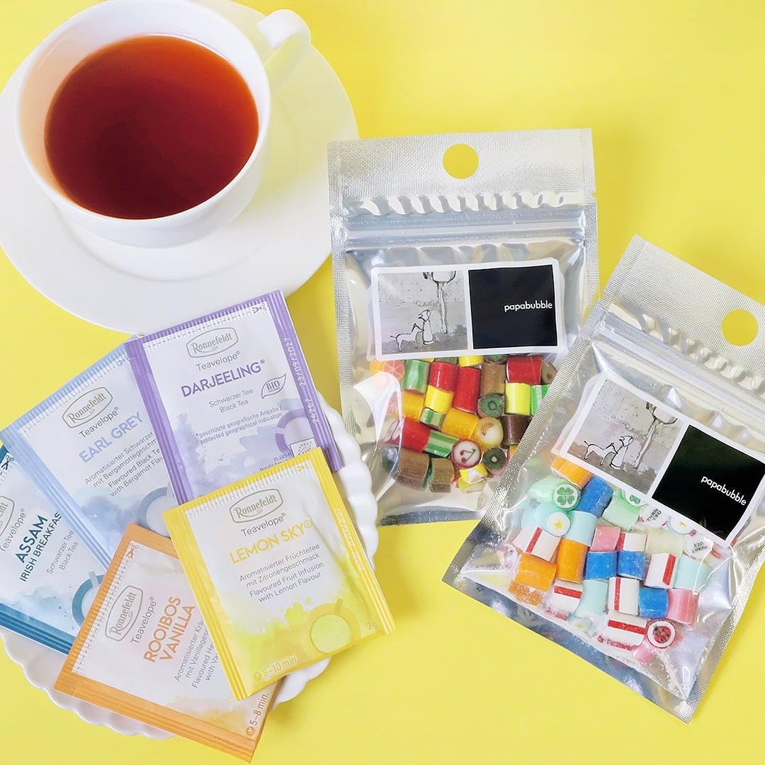高級ホテルのラウンジではお馴染みの高級紅茶ブランドロンネフェルトのティーバッグと、パパブブレのキャンディのコラボギフトは、見た目も華やかでギフトとしても喜んでいただけるコラボギフトに。
