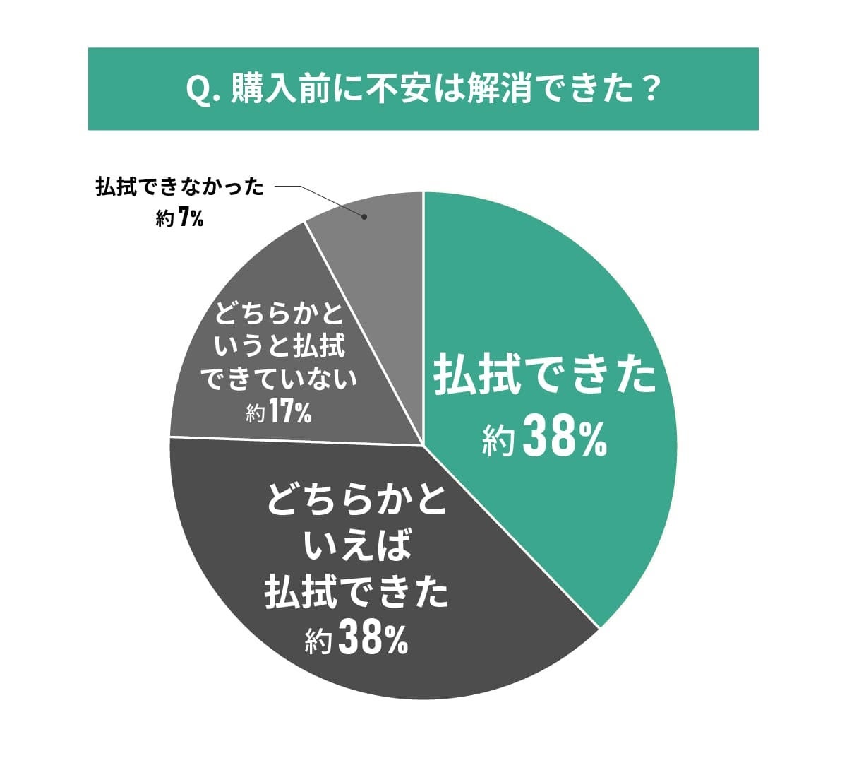 約76%の購入者が不安を解消できたと回答しています。一方で、約25%は完全には不安が解消できていない状況が明らかになりました。不安の種類によって解消の難易度が異なることがわかります。