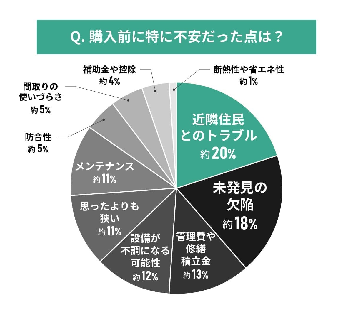 購入前の不安要素は多岐にわたりますが、近隣住民とのトラブルが最も多い結果となりました。物件そのものの品質だけでなく、住環境全体への関心が高いことが読み取れます。