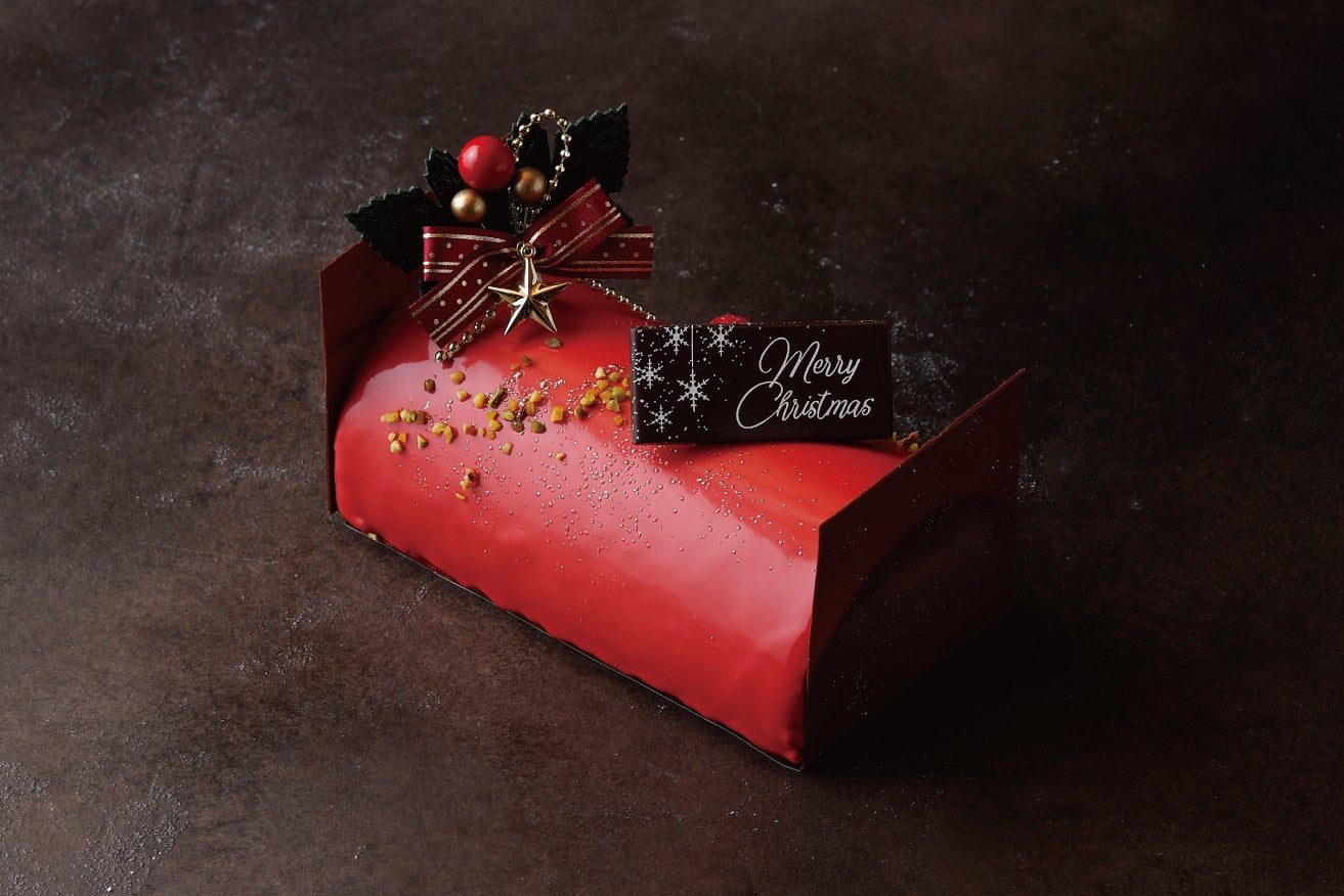 ピスタチオ・クレームブリュレとフランボワーズのジュレをふんだんに使用したムース。そこに濃厚なチョコレートムースと甘酸っぱいラズベリーを合わせたガトーノエル。真っ赤なグラサージュで華やかに仕上げた見た目にも美しいガトーノエルです。