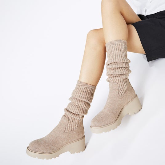 昨年大人気だった「Eduarda」は、その日の気分でアレンジができる2way仕様。脚を美しく見せてくれるニットソックスのようなアッパーは伸ばして履いたり、くしゅっとルーズソックス風に履いたり自由に調整可能。熱循環テクノロジーで保温性も高く、V-pro Walksole(TM)︎を採用したウェッジ(TM)︎により優れた衝撃吸収性とトランクションが実現していることから、シティ使いだけでなく、自然の中でのハイキングにも適しています。さらに、アッパーには撥水加工が施されているため突然の雨でも快適さがキープされます。超人気K-popアイドルにもコンサートで着用いただいたアイテムです。