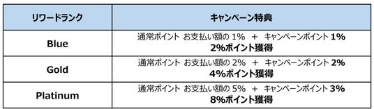 Samsungオンラインショップ(https://www.samsung.com/jp/offer/)にて期間中に対象製品をご購入いただくと、リワードポイントを通常ポイントにプラスして還元いたします。リワードのランクによってポイント還元率(%)は異なります。詳細は以下の表をご確認ください。