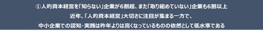 近年、「人的資本経営」大切さに注目が集まる一方で、中小企業での認知・実践は、昨年よりは高くなっているものの依然として低水準である