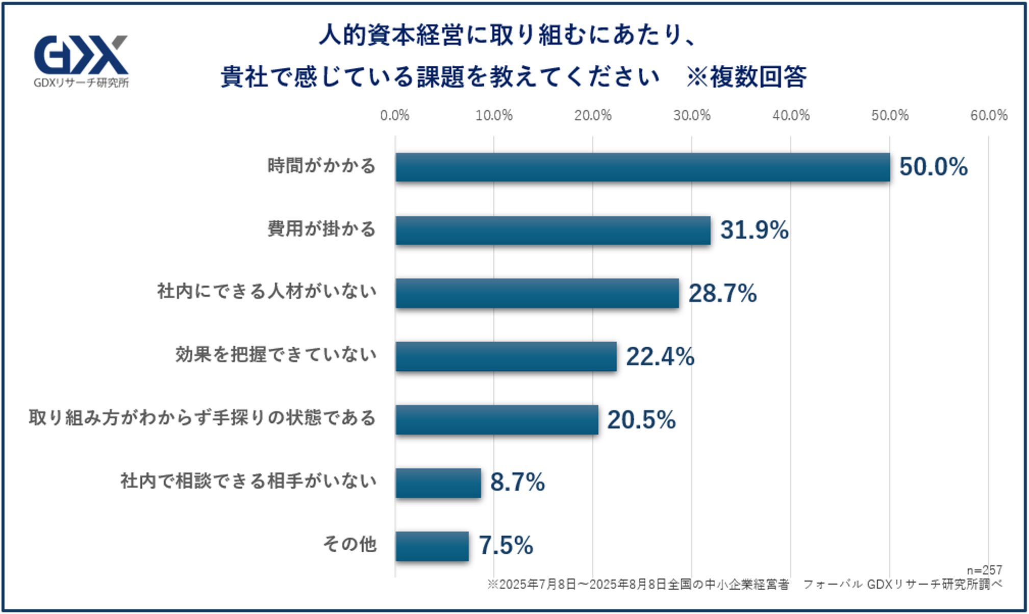 Q2で人的資本経営に取り組んでいると回答した経営者に取り組むにあたっての課題を尋ねた質問では、「時間がかかる」(50.0%)という回答が半数を占め最も多く、次いで「費用が掛かる」(31.9%)、「社内にできる人材がいない」(28.7%)、「効果を把握できていない」(22.4%)が続きました。また人材不足に関連し、「社内で相談できる相手がいない」(8.7%)という回答も見られ、人的資本についての取り組みを行うにあたっての時間や費用だけでなく、人材不足といった社内リソースの不足が顕著に現れる結果になりました。