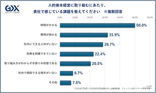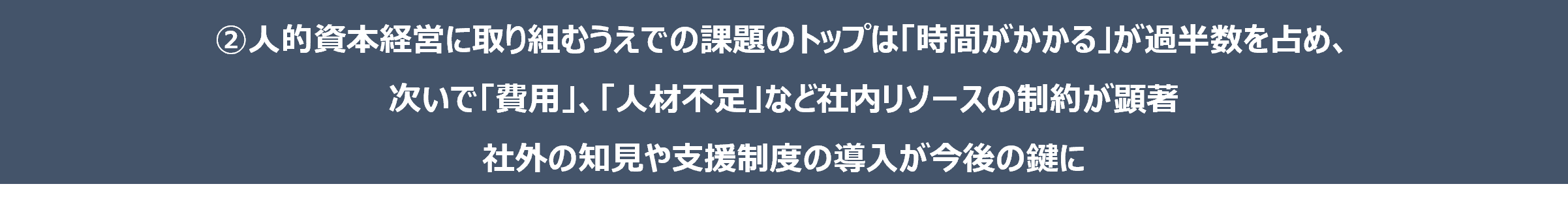 2.人的資本経営に取り組むうえでの課題のトップは「時間がかかる」が過半数を占め、次いで「費用」、「人材不足」など社内リソースの制約が顕著
