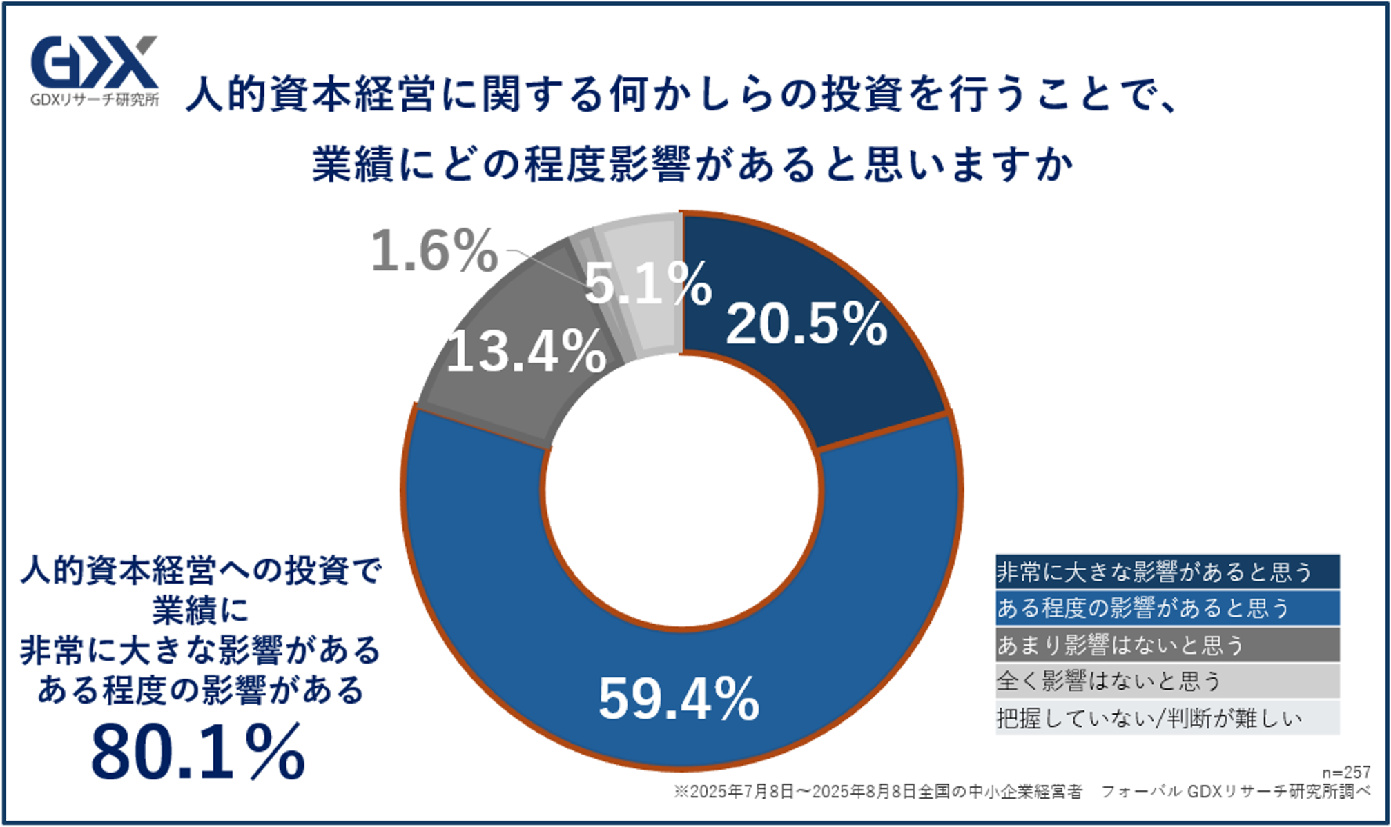 また、 Q2で人的資本経営に取り組んでいると回答した経営者に、人的資本経営に関するなにかしらの投資を行うことで、業績に影響があるかどうかどう考えるかを問うと、「非常に大きな影響があると思う」(20.5%)、「ある程度の影響があると思う」(59.4%)と約8割が影響があると考えていることがわかりました。