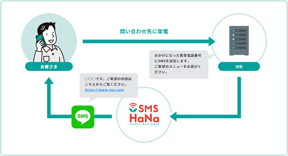 「IVR連携」は、企業がIVR(自動音声応答システム)を用いて電話の一次対応を自動化するシーンにおいて活用できるSMS HaNaの新機能です。企業の問い合わせ先に架電したお客様に対し、SMSを自動送信することができます。