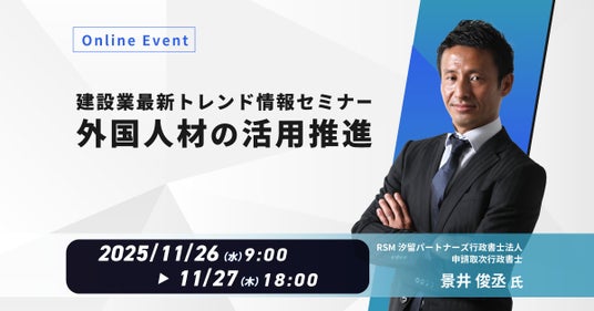 本セミナーでは、外国人材の活用に関する最新の制度設計や、建設業界で必要とされる在留資格の概要について、申請取次行政書士である景井俊丞氏(RSM汐留パートナーズ行政書士法人)がわかりやすく解説します。