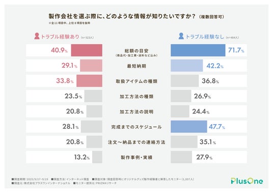 最後に、「今後、どのような点を重視して製作会社を選びたいと思いますか?(複数選択可)」と質問したところ、トラブル経験の有無に関わらず『価格の安さ』『納期の早さ』『取り扱いアイテムの豊富さ』が上位に挙がりました。