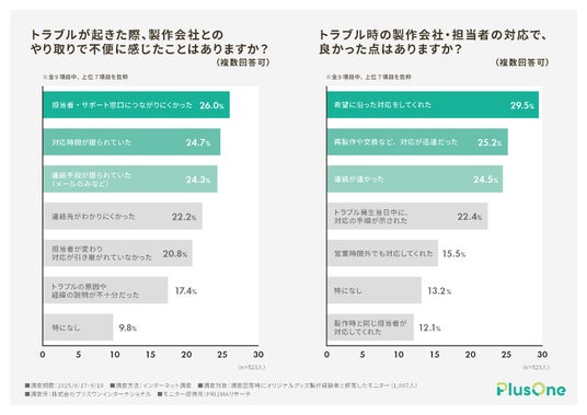 続いて、「トラブル時の製作会社・担当者の対応で良かった点」について聞いてみたところ、『希望に沿った対応をしてくれた(29.5%)』と回答した方が最も多く、『再製作や交換など、対応が迅速だった(25.2%)』『連絡が速かった(24.5%)』と続きました。