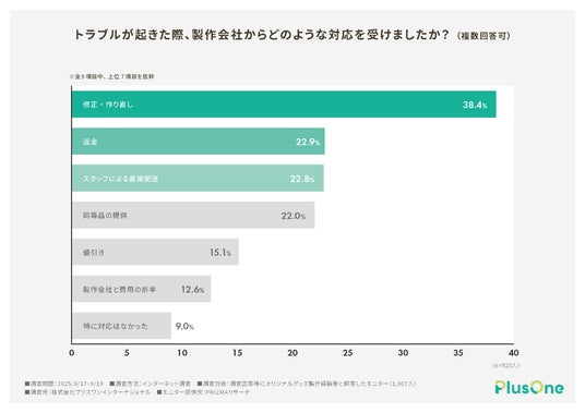 トラブルを経験したことがある方を対象に、「トラブルが起きた際、製作会社からどのような対応を受けましたか?(複数回答可)」と質問したところ、『修正・作り直し(38.4%)』と回答した方が最も多く、次いで『返金(22.9%)』『スタッフによる直接配送(22.8%)』となりました。