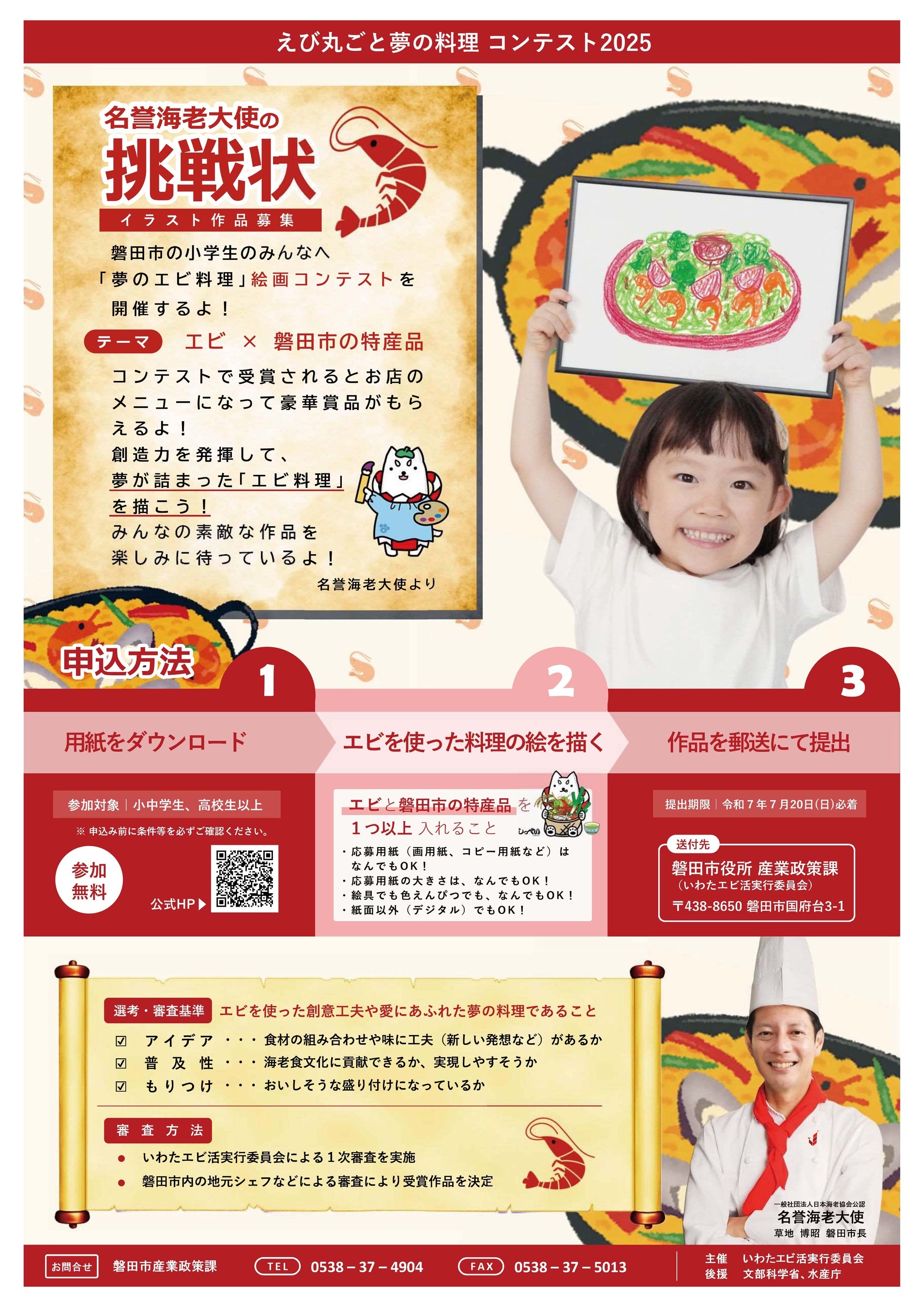 新たな特産品となった磐田市の陸上養殖エビを「知ってもらう、食べてもらう」ため「えび丸ごと夢の料理コンテスト」を開催しました。名誉海老大使を務める草地市長も登場します。受賞作品は、磐田市内のシェフなどにより実際にメニュー化され、お店で実際に食べることができます!