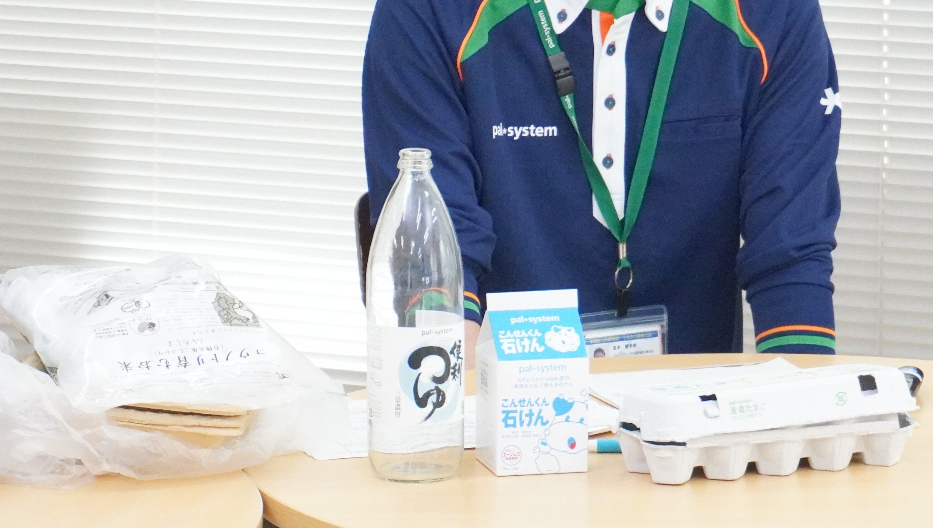 担当者の視点から、パッケージのリサイクルに関する法律「容器包装リサイクル法」やパルシステムが実施する牛乳や卵のパック、米袋などの資源回収を説明し、利用者に向け資源回収への協力に感謝を伝えました。より質の高いリサイクルを効率的に進めるため「容器を返却する際は輪ゴムでまとめたりせず、容器のみを種類ごとにまとめてください」と呼びかけました。