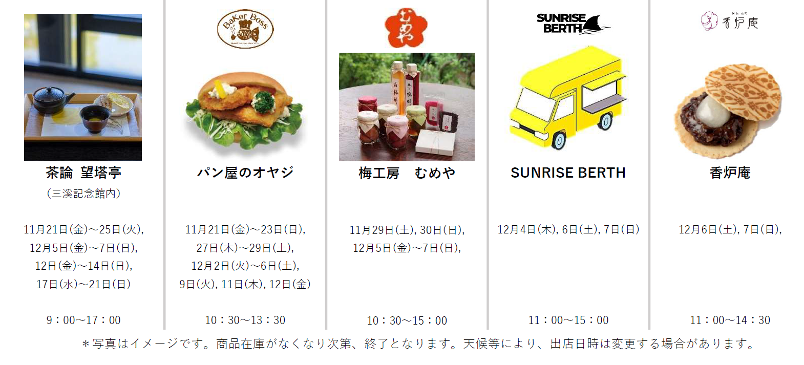 ポップアップカフェスペース茶論望塔亭にて「日本茶専門店 茶倉 SAKURA」がお茶や和菓子を提供します。また、根岸駅にあるコッペパンが人気の「パン屋のオヤジ」、横浜ゆかりの杉田梅を使った手作り梅加工食品店の「梅工房むめや」、漁師さんのキッチンカー「SUNRISE BERTH(サンライズバース)」、元町の和菓子店「香炉庵」が期間限定で出店します。