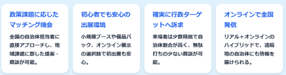 自治体営業について、これから始める・事業拡大を目指す企業・団体の皆様に、「ちょうど良い」展示会として様々なPR、交流、そして商談機会を提供しております。