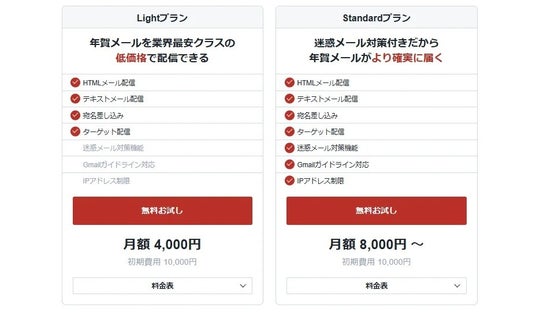 料金プランは業界最安クラス。年賀メール用のスポットとして利用しやすいよう月額4,000円から使える(Lightプランの場合)料金設定となっています。※最低契約期間:3ヶ月