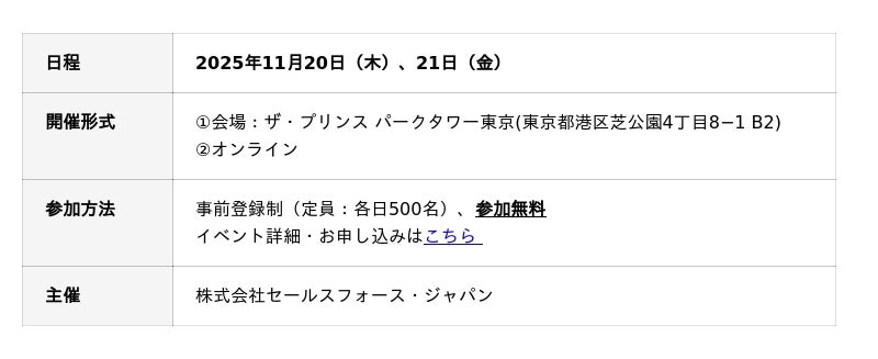 アルティウスリンク株式会社(本社:東京都渋谷区、代表取締役社長:那谷 雅敏、以下 アルティウスリンク)は、株式会社セールスフォース・ジャパン主催の「Agentforce World Tour Tokyo」に協賛します。