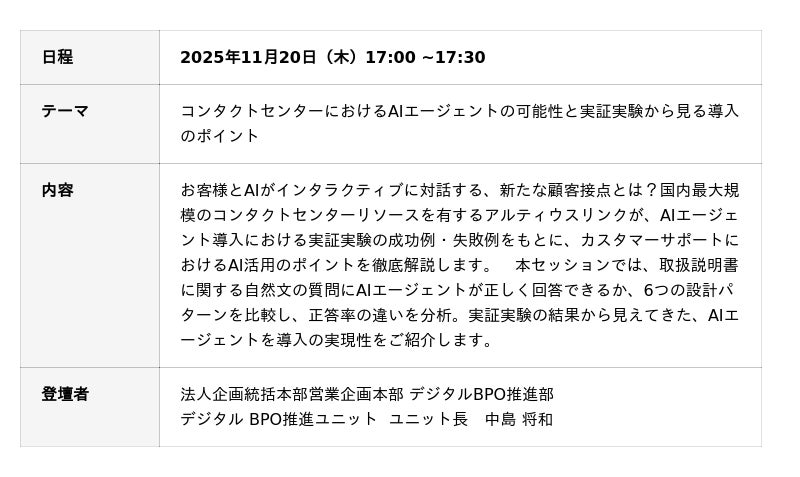 また2025年11月20日(木)にはセッションに登壇し、カスタマーサポートにおける有効性を検証した実証実験の結果をもとに、AIエージェントの導入ポイントについて解説します。