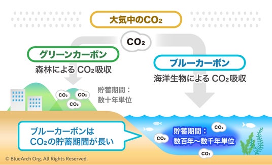 ブルーカーボンとは、ワカメやアマモ、マングローブなどの海洋生態系の光合成によって吸収され、その後海底や深海に貯蓄される炭素のことを呼びます。ブルーカーボンは、森林などのグリーンカーボンに比べてCO2の貯蔵期間が長く、また、ブルーカーボン生態系は、魚など海の生物の産卵場としての機能も果たすため、気候変動対策と生物多様性の保護の両方に貢献できることから注目されています。