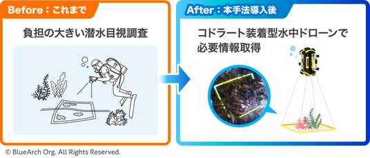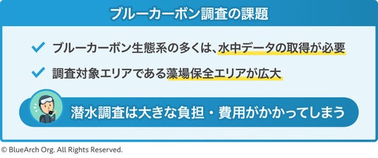 従来の方法では、人が潜って広大な保全エリアを調査する手法が採られていたため、金銭的・時間的コストがかかり、ブルーカーボン・クレジット制度の普及における課題の一つとなっていました。