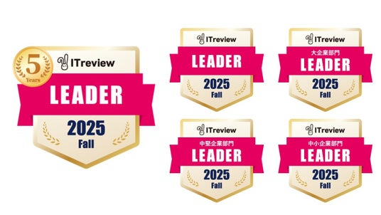 10月に発表された「ITreview Grid Award 2025 Fall」では、ITreviewに集まった約14.6万件のレビューをもとに、顧客満足度と認知度の双方が優れた製品を「Leader」として表彰、バッジが発行されています。ITreviewのLeaderは多くの利用者から支持を得ている証であり、大企業や中堅企業、中小企業といった各企業規模のユーザーから高評価だった場合にも、大企業部門のLeader、中小企業部門のLeaderなどと称号が与えられています。