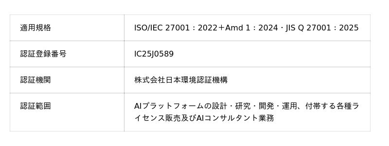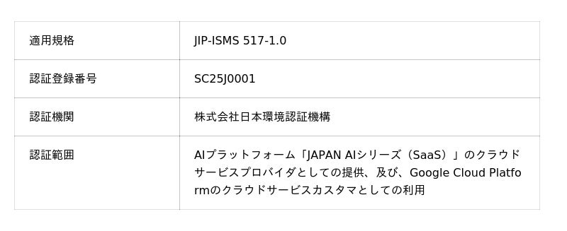 JAPAN AI株式会社(本社:東京都新宿区、代表取締役社長:工藤 智昭、以下JAPAN AI)は、2025年9月30日付で、情報セキュリティマネジメントシステム(ISMS)の国際規格「ISO/IEC 27001」およびISMSクラウドセキュリティの国際規格「ISO 27017」の認証を取得したことをお知らせします。