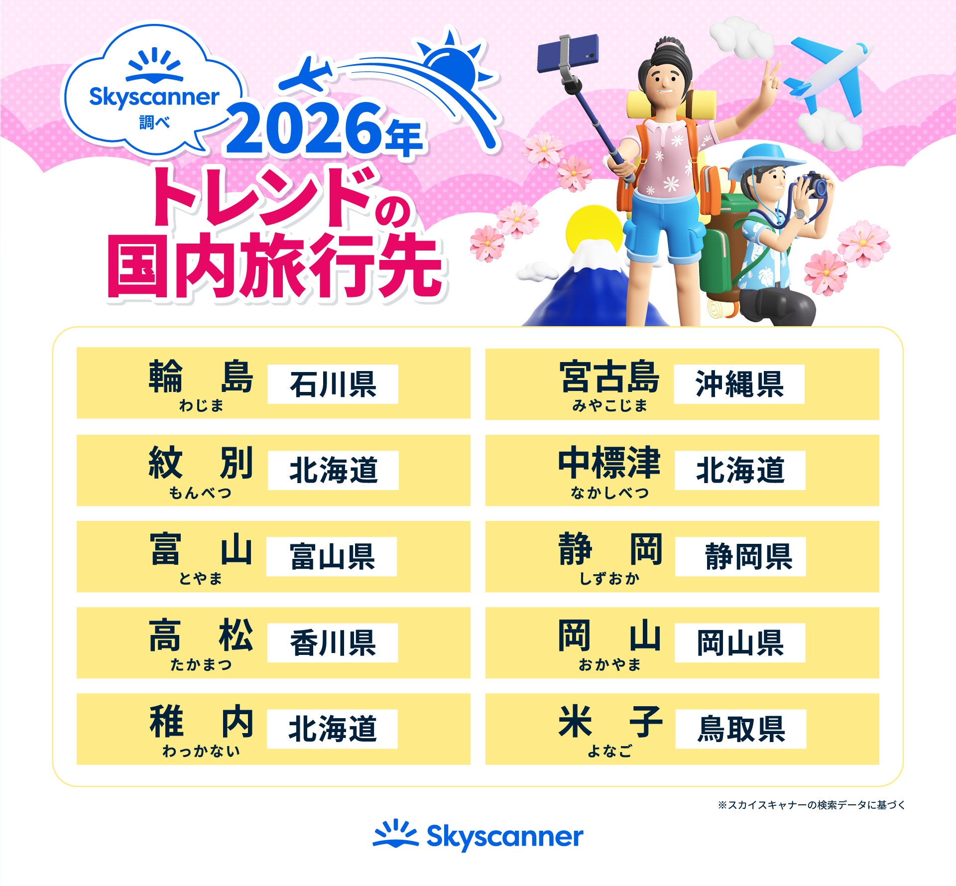 この度、スカイスキャナー独自の検索データ数万件以上を分析し、 日本人旅行者および海外の旅行者、それぞれにおける「2026年 トレンドの “国内”旅行先」を発表します。