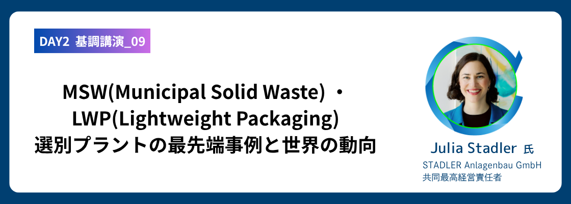 世界トップクラスのリサイクルプラントメーカーSTADLER社で経営を統括するJulia Stadler氏は、欧州を中心に数多くのMSW(一般廃棄物)やLWP(軽量包装材)選別プラントの設計・運営を牽引してきました。Julia Stadler氏は、世界各地の最新事例と市場動向を紹介し、持続可能な資源循環社会の実現に向けたプラント技術の最前線を伝えます。