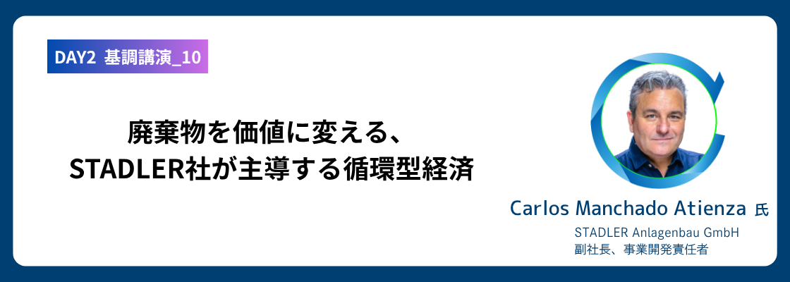 廃棄物管理業界で豊富な実績を持つ産業エンジニアであるCarlos Manchado Atienza氏は、TOMRA社で欧州・ラテンアメリカ・米国の各地域統括を歴任し、現在はSTADLER社の国際営業ディレクターとして複数子会社の経営と事業開発を指揮しています。Carlos Manchado Atienza氏は、世界規模で培った経験をもとに、廃棄物を価値に変える循環型経済の最新動向と、STADLER社が推進する革新的な選別ソリューションを紹介します。
