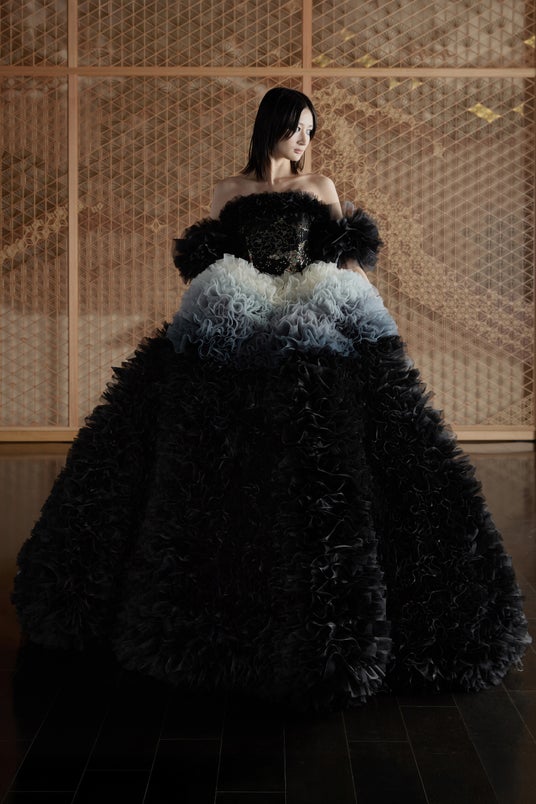 白から黒へ、滑らかなグラデーションフリルが可憐な「KOKU」。ウェストから裾元にかけて見事なグラデーションを奏でるフリルは、緻密に計算された構築的なパターンによって、より華やかなオーラを放ちます。