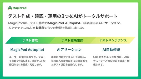 今回の機能追加により「MagicPod」は、テスト作成の「MagicPod Autopilot」、テスト結果確認の「AIアサーション」、テストメンテナンスの「AI自動修復」の3つの機能を搭載しました。これにより、作成・確認・運用の3つをトータルでAIがサポートします。