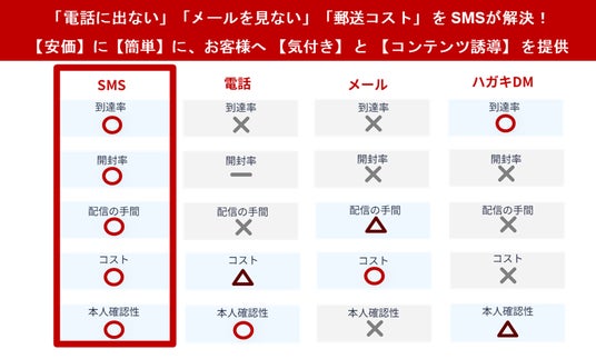 また、同様に郵送やメールによる連絡手段においても、誰からのメールかわからないので見てもらえない、郵送だとコストがかかりすぎる等の課題があり、特にメールアドレスを保有していない顧客へ連絡する場合は、接続率が低い電話かコストと手間のかかる郵送に頼らざるを得ない状況があり、SMS配信の要望が多くあります。