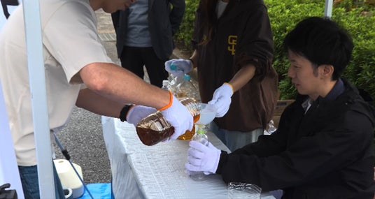 会場では、コスモエネルギーグループが使用済み食用油を原料として日本で初めて量産化を開始したSAFについても紹介しました。当社社長の山田が「従来のジェット燃料に比べてCO2を最大約80%削減できる新しい燃料」と説明すると、賀来さんも「本当に画期的な取り組み。使用済み食用油と燃料は結びつきにくいイメージがあるけれど、SAFのことを知った以上、SAFとは何かをわかりやすく世間に伝えるのが自分の使命だと感じています。少しでもSAFの輪が広がっていけば嬉しい」と語り、「循環型経済」への期待を込めました。