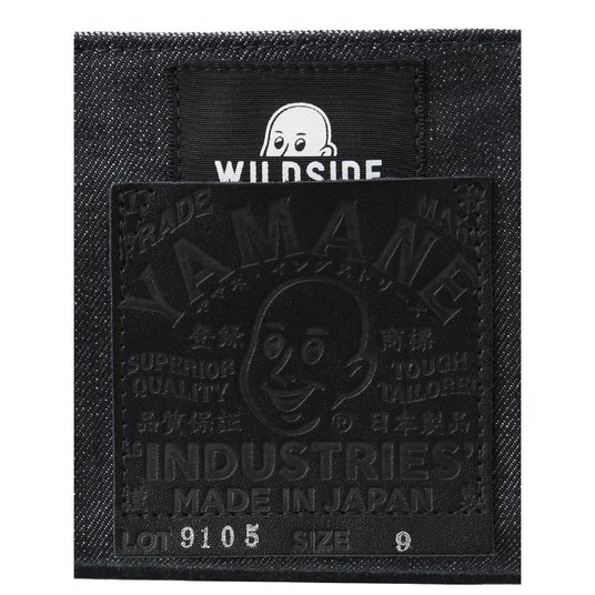 今回のコラボレーションでは、YAMANE INDUSTRIESの人気モデル「Lot.9111」と「Lot.9105」をベースに、限定仕様へとカスタマイズしました。フロントには、黒のエンボス加工を施したアイコニックな牛革パッチと、コラボレーションタグをあしらっています。ファスナーテープや金具もすべて黒で統一し、WILDSIDE YOHJI YAMAMOTOのアイテムと調和するトーンでまとめました。