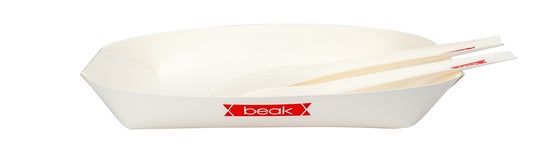 「beak」は、一枚のシートから簡単に組み立てられる、折り紙の発想から生まれた紙製食器です。保管時はA4サイズで場所を取らず、優れた省スペース性を実現します。耐水・耐油性を備え温かい食事にも対応でき、使用後は嵩張らず可燃ごみとして処理が可能です。