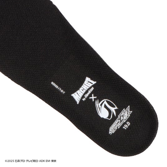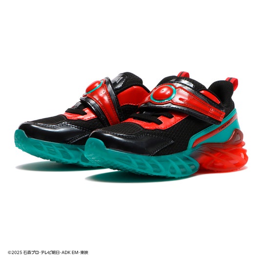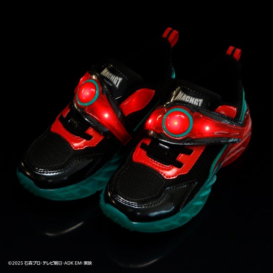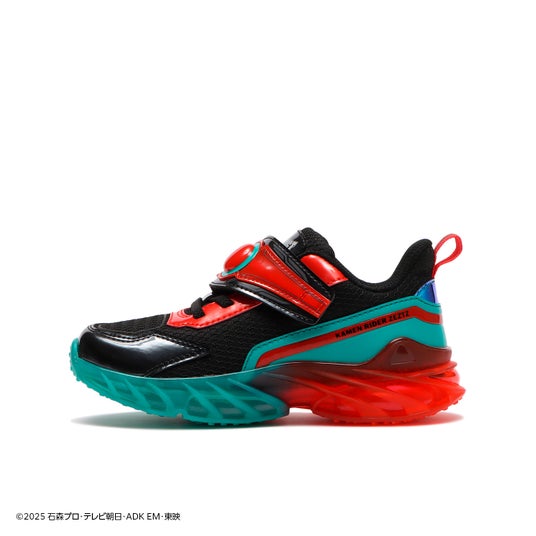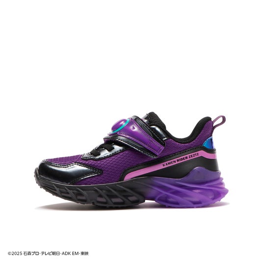 仮面ライダー史上初となる、“胸に巻く変身ベルト”「ゼッツドライバー」をモチーフに、シューズベルトをななめに取り付けた本商品は、歩くたびに振動によってベルト部分が光る仕掛けが施されています。アウトソールには近未来感を演出するクリアパーツを採用し、アッパー部分には仮面ライダーの特徴的な六角形柄のスーツをイメージしたメッシュ素材を使用しています。インソールにも仮面ライダーゼッツをプリントし、履くときに靴の左右がわかりやすい仕様になっています。カラーはフォームチェンジをイメージした全4色展開です。
