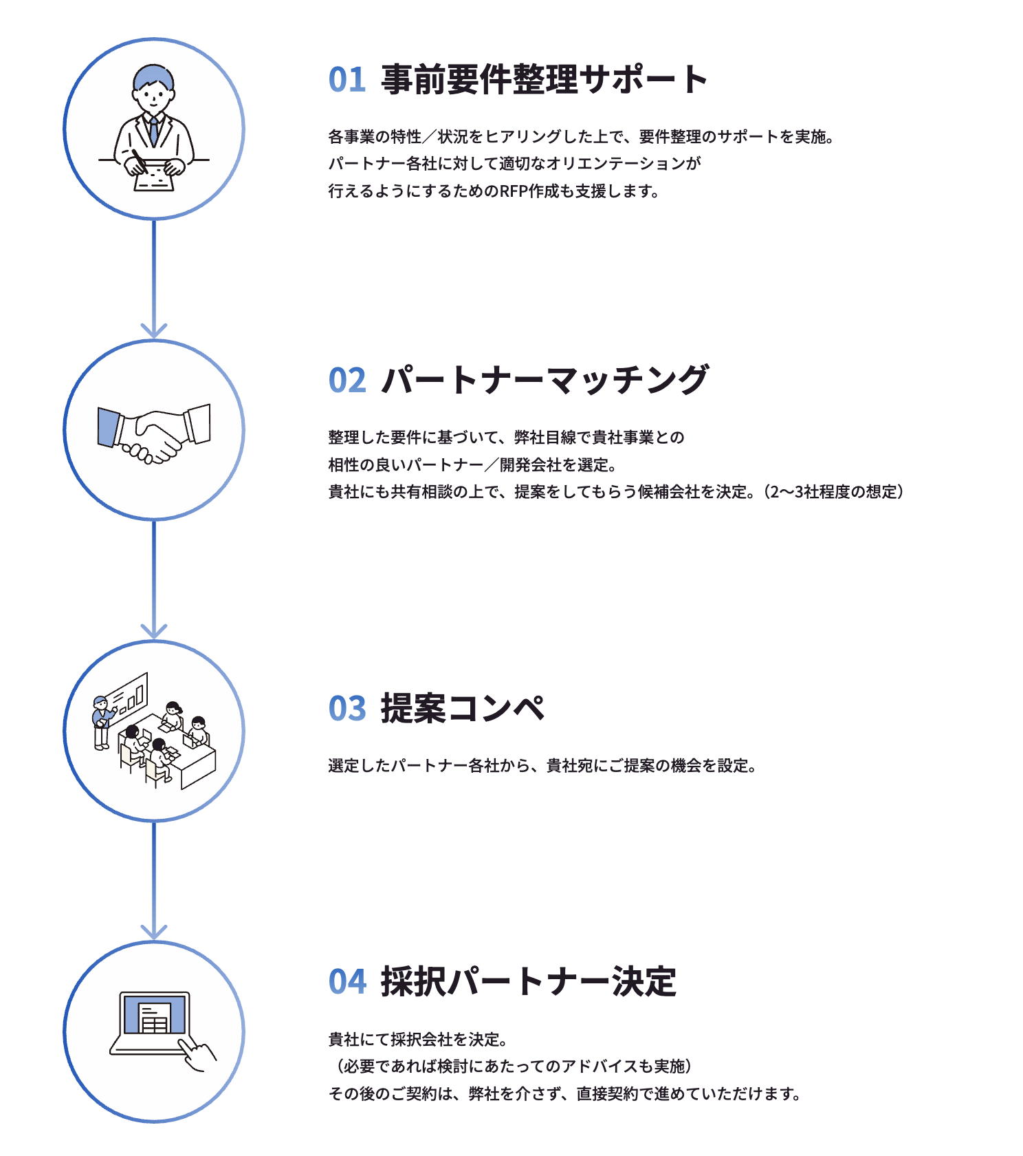 プロダクト開発を委託するパートナーを決定するまでに必要な全てのプロセスに対して「無償」にて伴走・サポートします。