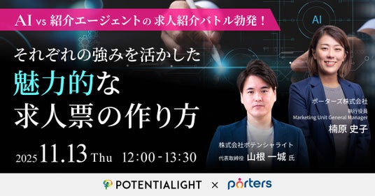 人材ビジネス向けマッチングシステムを提供するポーターズ株式会社(東京証券取引所グロース. 証券コード5126、東京都港区、代表 西森 康二)は、株式会社ポテンシャライト(以下、ポテンシャライト)と共同で「AI vs 紹介エージェントの求人紹介バトル勃発!それぞれの強みを活かした魅力的な求人票の作り方」と題した無料セミナーを2025年11月13日(木)12:00~オンラインで開催いたします。