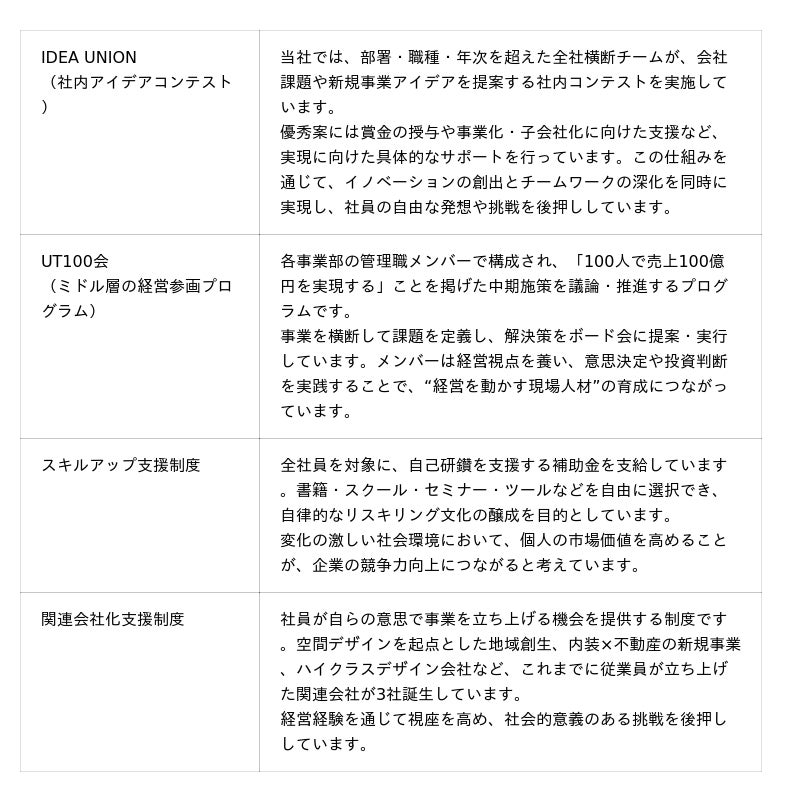 当社は、事業価値・企業価値の源泉を「個人」に置いています。特に、内装インテリア業のように個の専門性に依存するビジネスでは、個々の成長や満足度の向上、協業の質の高さが付加価値を左右します。そのため、当社では「成長の機会」「協働の機会」「成果に見合う報酬」の3軸を重視し、仕組みを整備しています。