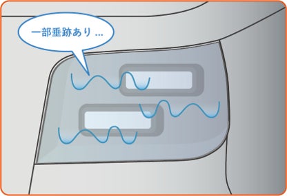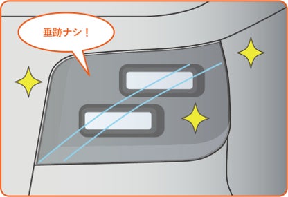 従来は、ランプ内部の塗料に含まれるアニオン性界面活性剤が結露によって流れ出し、乾燥して固まることで、白い跡(垂跡)が生じることがありました。ASTUVでは、ランプ内部の塗装にアニオン性界面活性剤を含まないため、水滴による影響が無く、垂跡が発生しません。また水に強いUV硬化膜がヘッドランプの曇りを長期的に防ぎます。