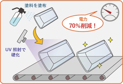 新開発のUV硬化塗料と、熱風を使わずUV光源により硬化する製造技術の導入は業界初となり、当社ヘッドランプの製造工程の中でASTUVに置き換えられる工程において、消費電力を当社現状比で70%以上*(注記)削減可能となります。