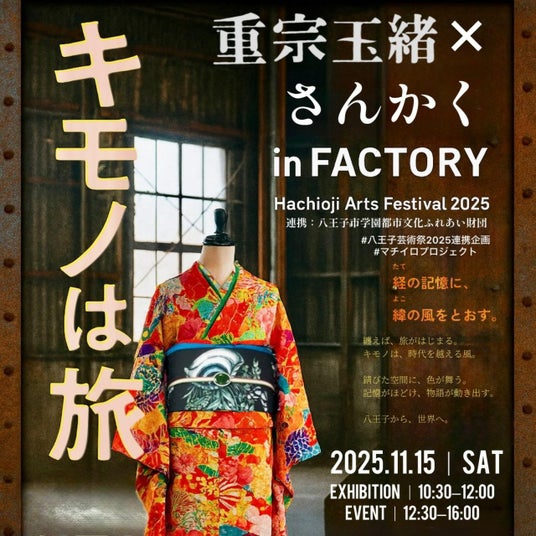 重宗玉緒 × さんかく in FACTORY (11月15日@ファーストライブ八王子スタジオ) 旧鉄鋼工場を舞台に開催される特別なイベント。現代キモノの革新者・重宗玉緒さんとさんかくさんによるトーク&展示を通して、色彩と物語が交差するキモノを巡る“旅”を八王子から世界へ発信します。