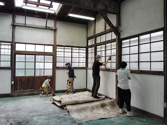 織物工場跡。芸術祭メイン会場。美術展示のほかに、地域の職人さんやお店とコラボレーションをして制作した、公式グッズの販売なども行います。作家さんや地域の方とお掃除している様子。