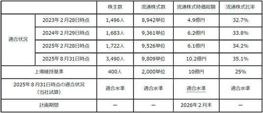 当社の東証スタンダード市場の上場維持基準への適合状況は、その推移を含め下表のとおりであります。2025年2月28日時点では、流通株式時価総額が適合しておりませんでしたが、東証スタンダード市場の上場維持基準への適合に向けた計画(2023年5月26日開示)に基づき取組みを推進した結果、2026年2月期中間期末(2025年8月31日)時点において適合する水準まで改善している状況となりました。